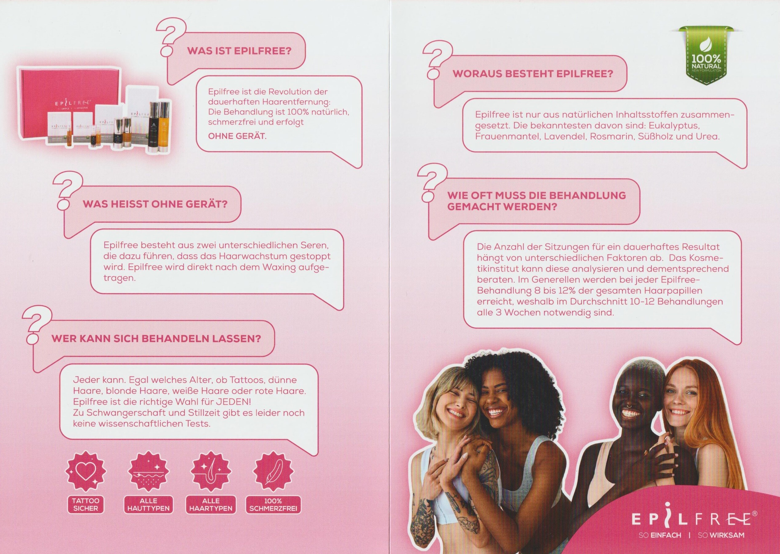 Dank dieser natürlichen Formel ist EPILFREE für alle Hauttypen geeignet – auch bei Tattoos – und funktioniert bei jeder Haarfarbe, selbst bei hellen, roten oder grauen Haaren.